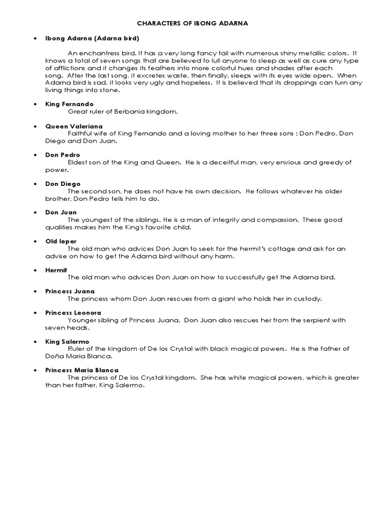 Script used for my younger sisters Ibong Adarna Play. Your email address will not be published. It was ruled by King Fernando and Queen Valeriana who had three sons Don Pedro first born Don Diego second and Don Juan the youngest.