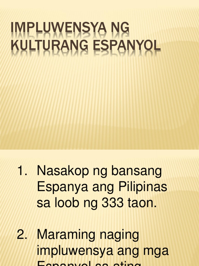 Mga impluwensya ng kulturang espanyol sa kulturang pilipino. Nasakop ng bansang Espanya ang Pilipinas sa loob ng 333 taon. 2Sa inyong palagay madali kayang naimpluwensyahan ang mga Pilipino ng kulturang Espanyol.