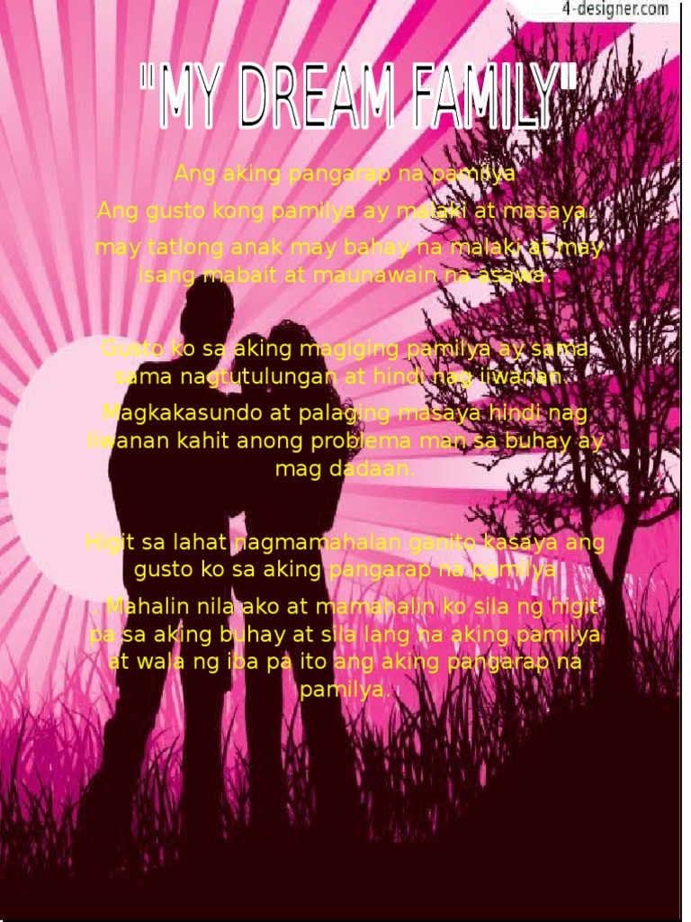 16092017 Ang aking pangarap ay maging isang matagumpay na electrical engineer mula pagkabata ko iyon na talaga ang aking pinapangarap dahil gusto kong mabigyan ang aking mga magulang na napakarangal na trabaho kaya ngayon msa pagbubutihan ko pa ang aking pag aaral nang sagayon marating ko ang aking pangarap na iyon nagpapasalamat ako sa aking mga. Contextual translation of ang aking pangarap na bahay sa wakas eto na. Alam kong mahirap ang trabaho ng doktor Pero eto talaga ang gusto kong propesyon.